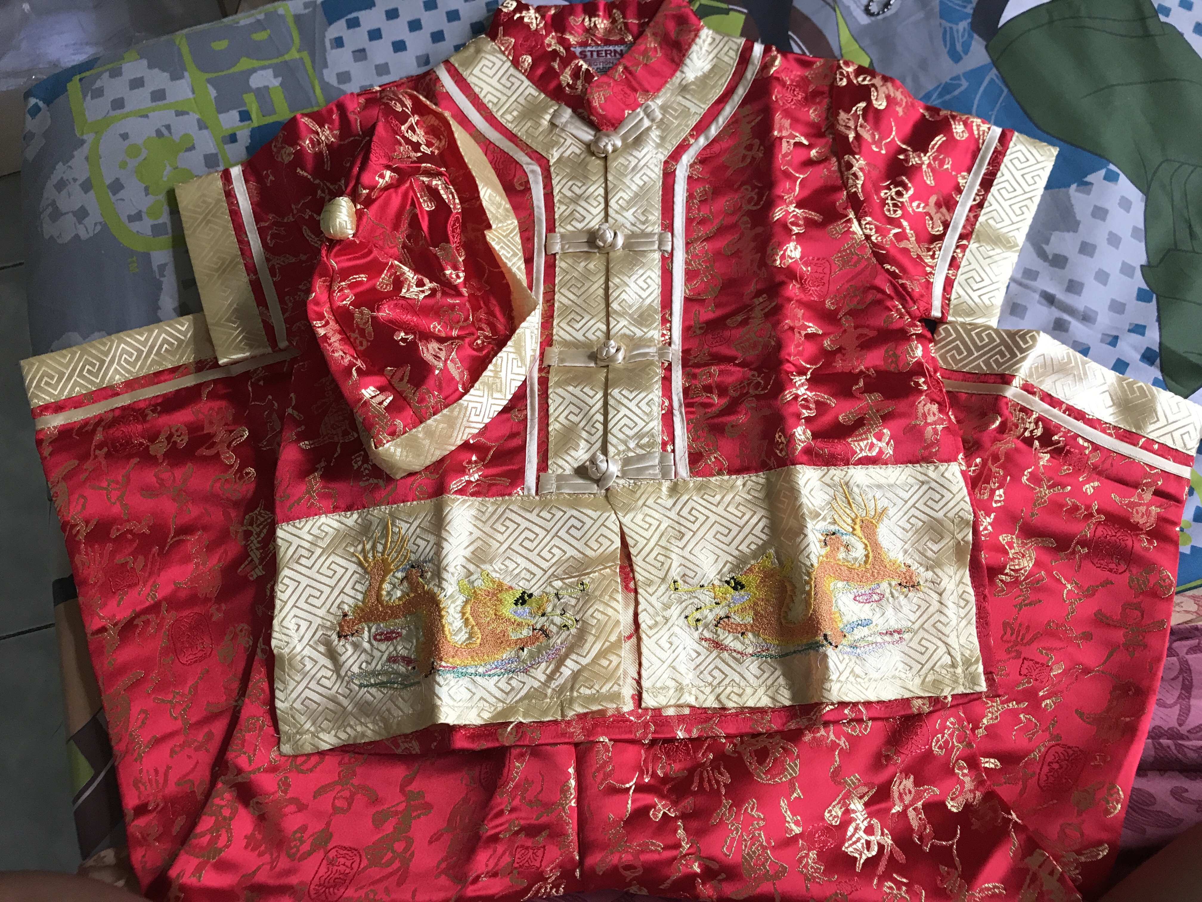 ชุดตรุษจีนเด็กชาย อาตี๋น้อย ชุดขายาว ผ้าแพรทอลายสวยงามทั้งตัว มีหมวกเข้าชุด